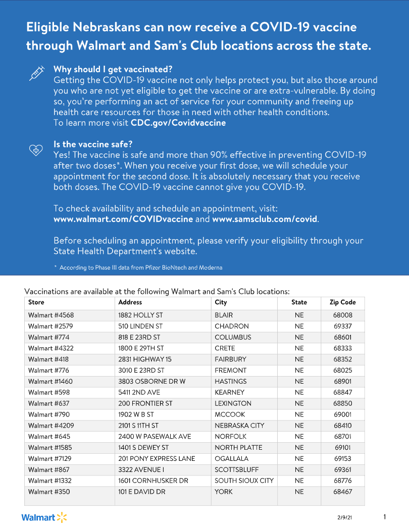 Though the locations are scattered throughout Nebraska geographically, none are in Lincoln or Omaha. Walmart says location decisions were made with an “emphasis on locations that reach customers in underserved communities with limited access to health care.” Omaha and Lincoln have lagged behind the rest of the state in the earliest phases of vaccine distribution.
